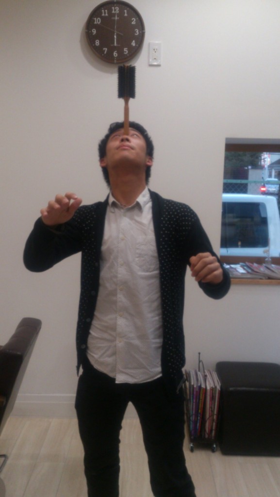 次に、額で棒を立たせれると言うので、ロールブラシ立たせちゃいました!