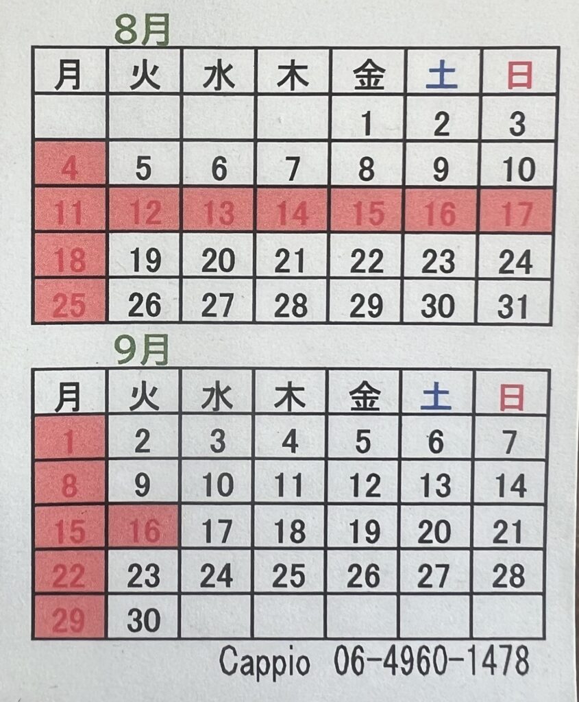 明日8月11日(月)〜8月18日(月)までお盆休みです。