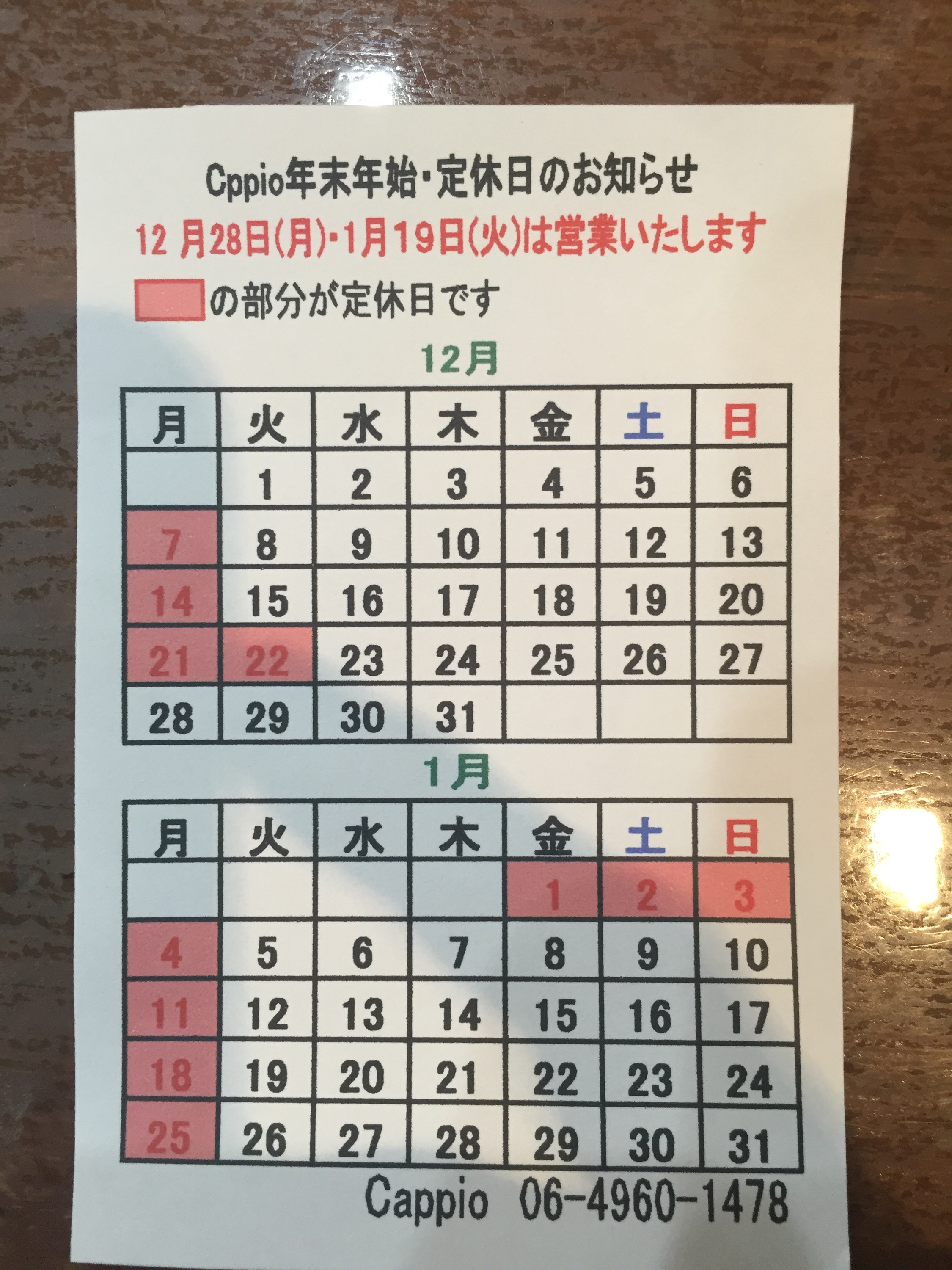 cappio(カッピオ)の年末年始のお休みです